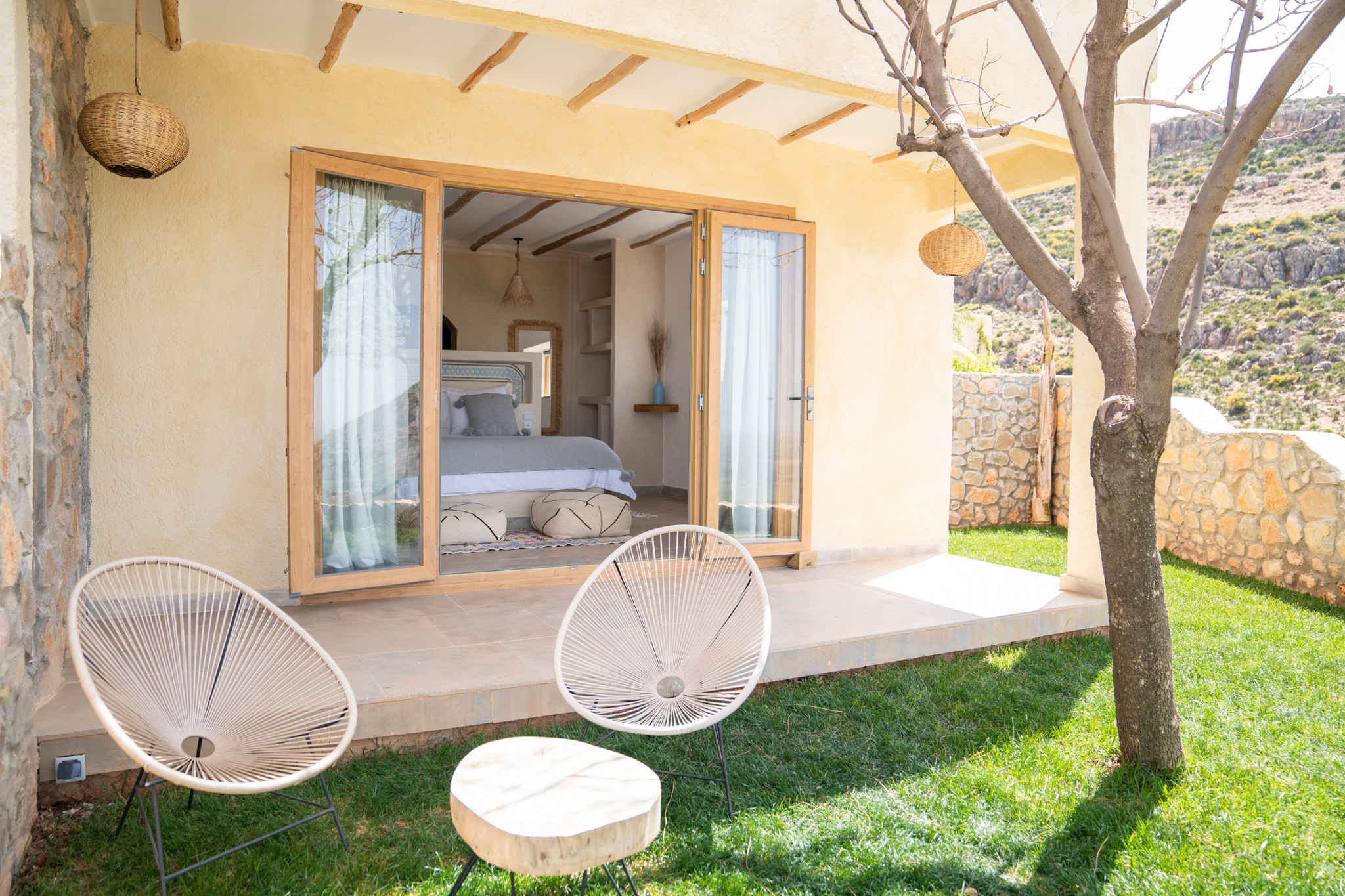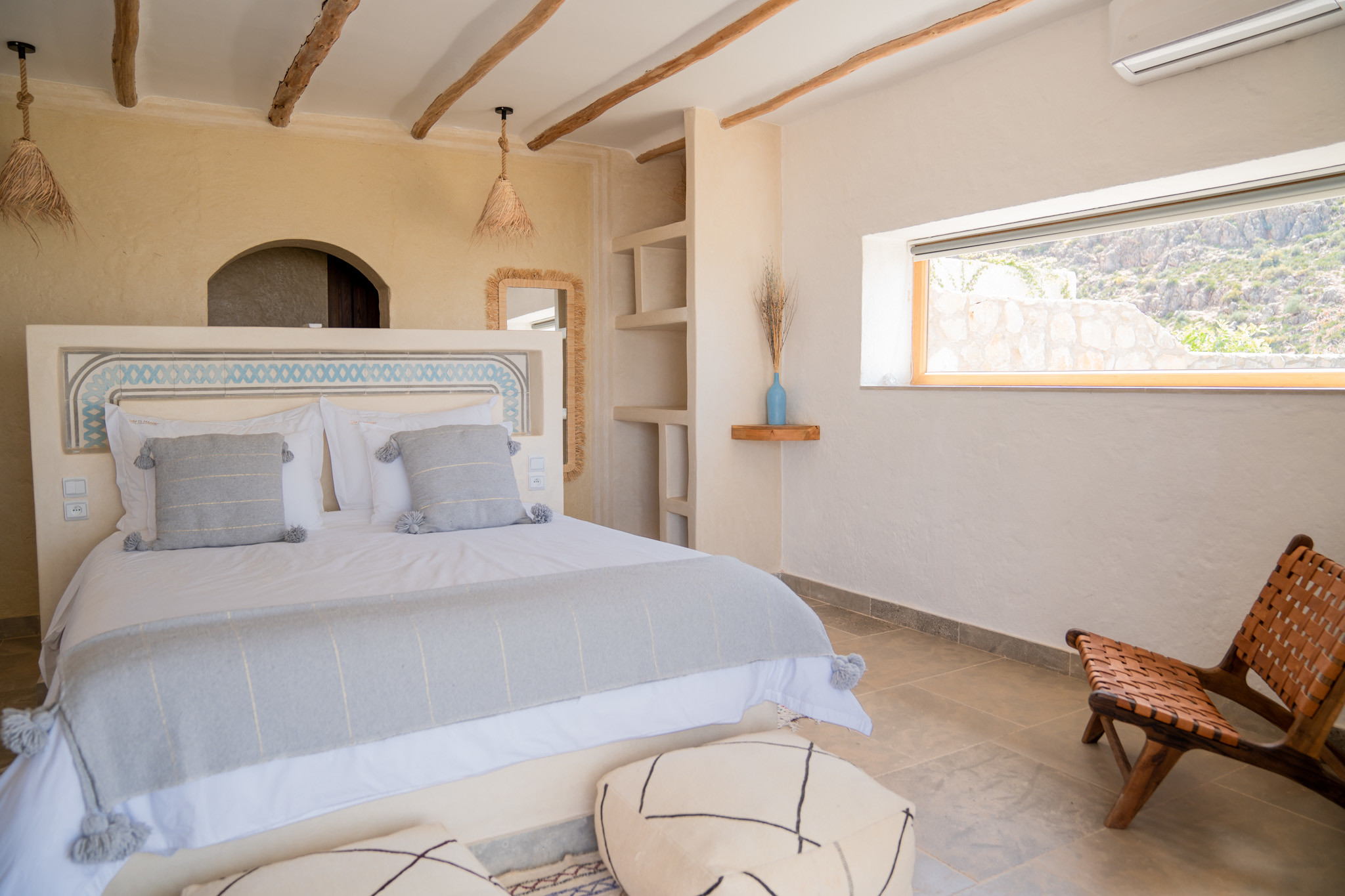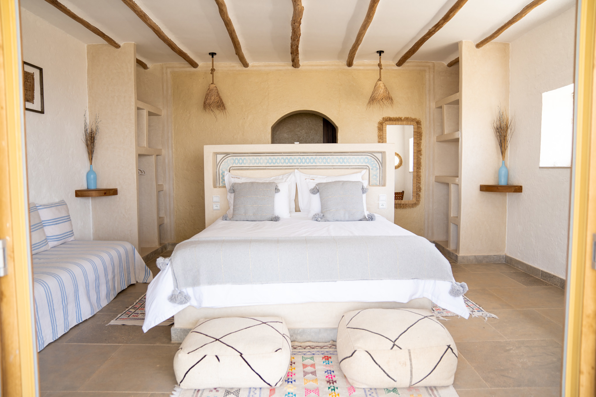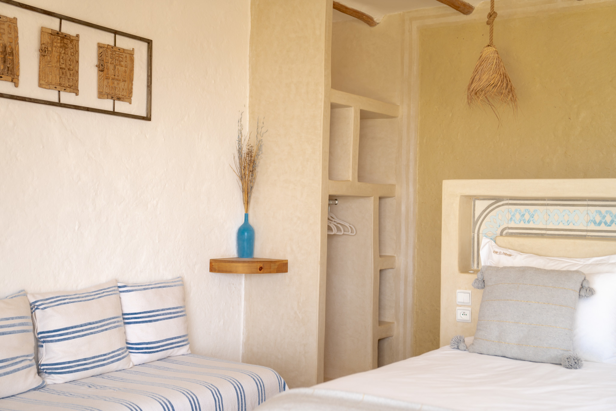 Clair, spacieux et élégamment conçu, la Chambre Double Supérieure N°7 est un véritable sanctuaire de confort et d’authenticité. Inspirée des traditions berbères et réalisée avec des matériaux nobles, elle crée une atmosphère chaleureuse et raffinée.